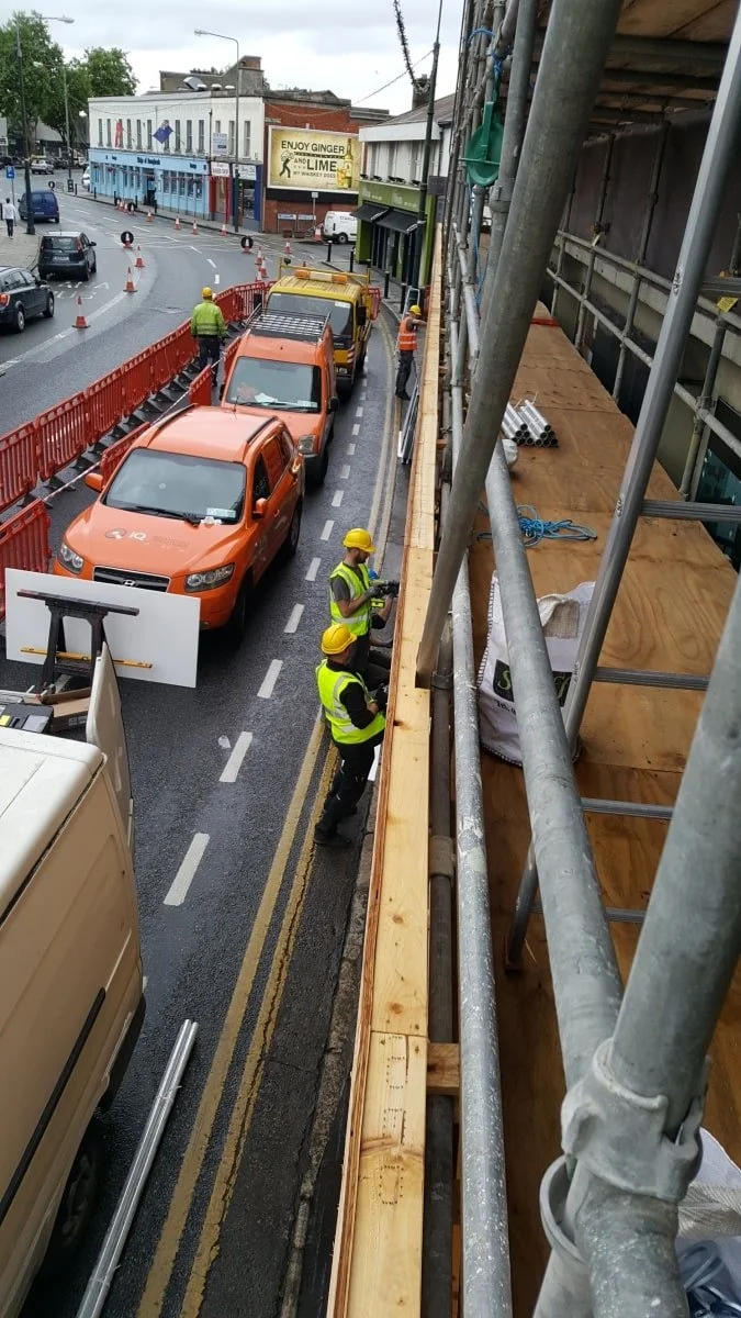 The first step was to build one of our custom alu-frames onto the scaffold. This is a perfectly engineered frame that we clamp onto the front and returns of the scaffold to millimetre precision.