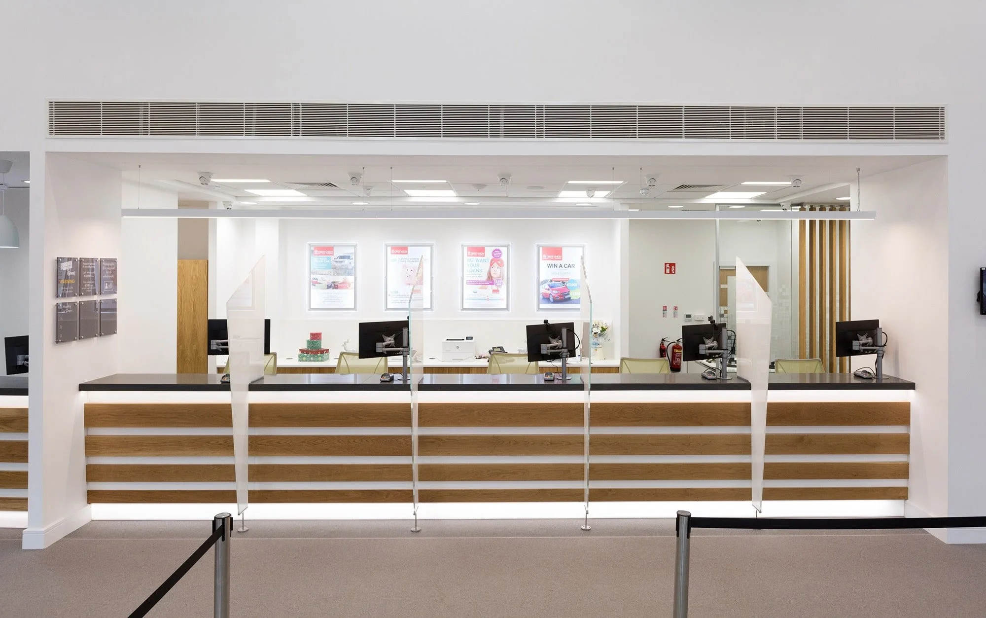 Creating a modern banking environment via integrated interior and exterior signage solutions.
